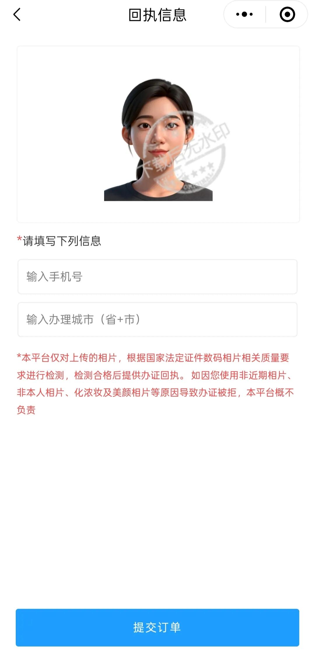 第四、等待10-30分钟左右,回执办理成功后,微信的“服务通知”会推送消息进行提醒,如办理失败也会有短信通知。重新进入照片回执号小程序,点击底部的“证件照”按钮,进入后可以下载回执单到手机上面,最后就可以去办理相关证件啦!