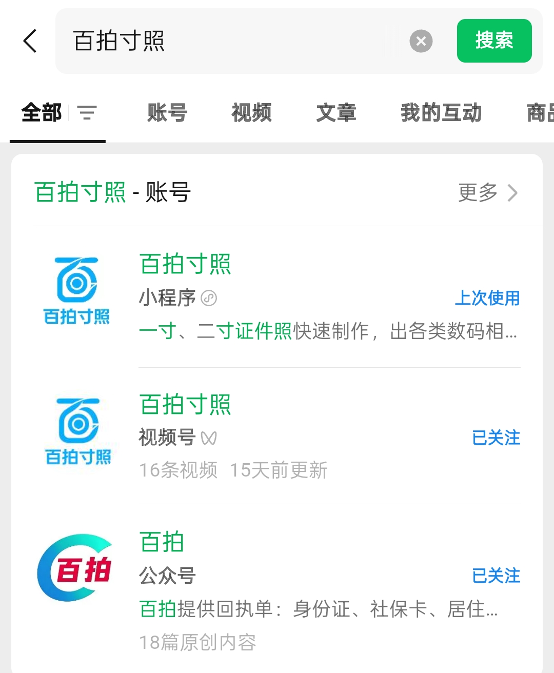 第一步、打开微信搜索小程序/公众号“百拍寸照”即可在线办理。